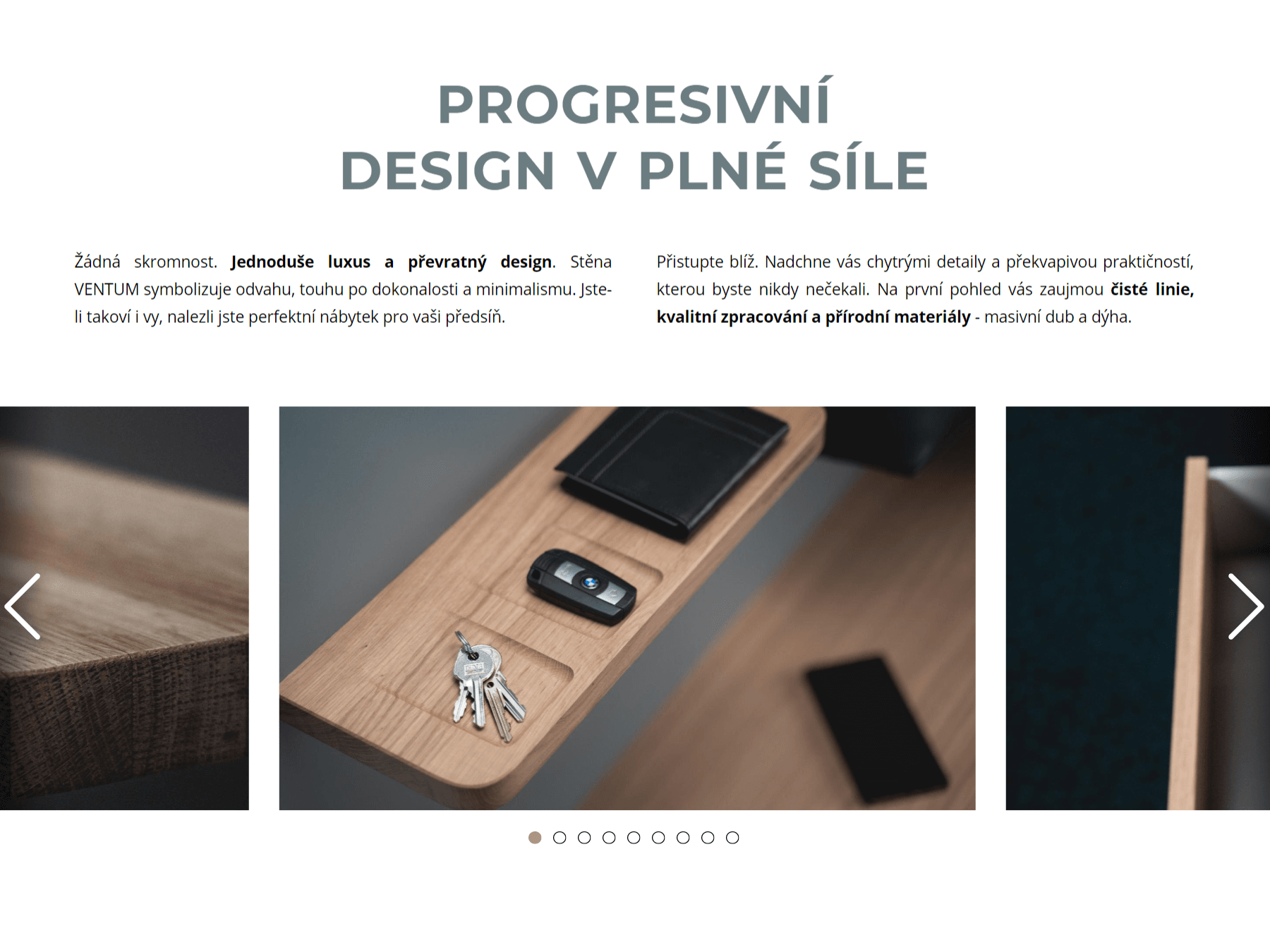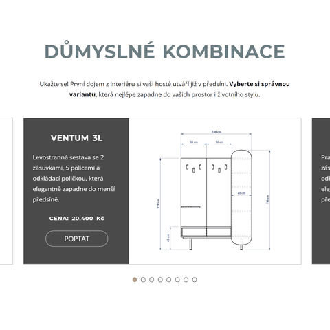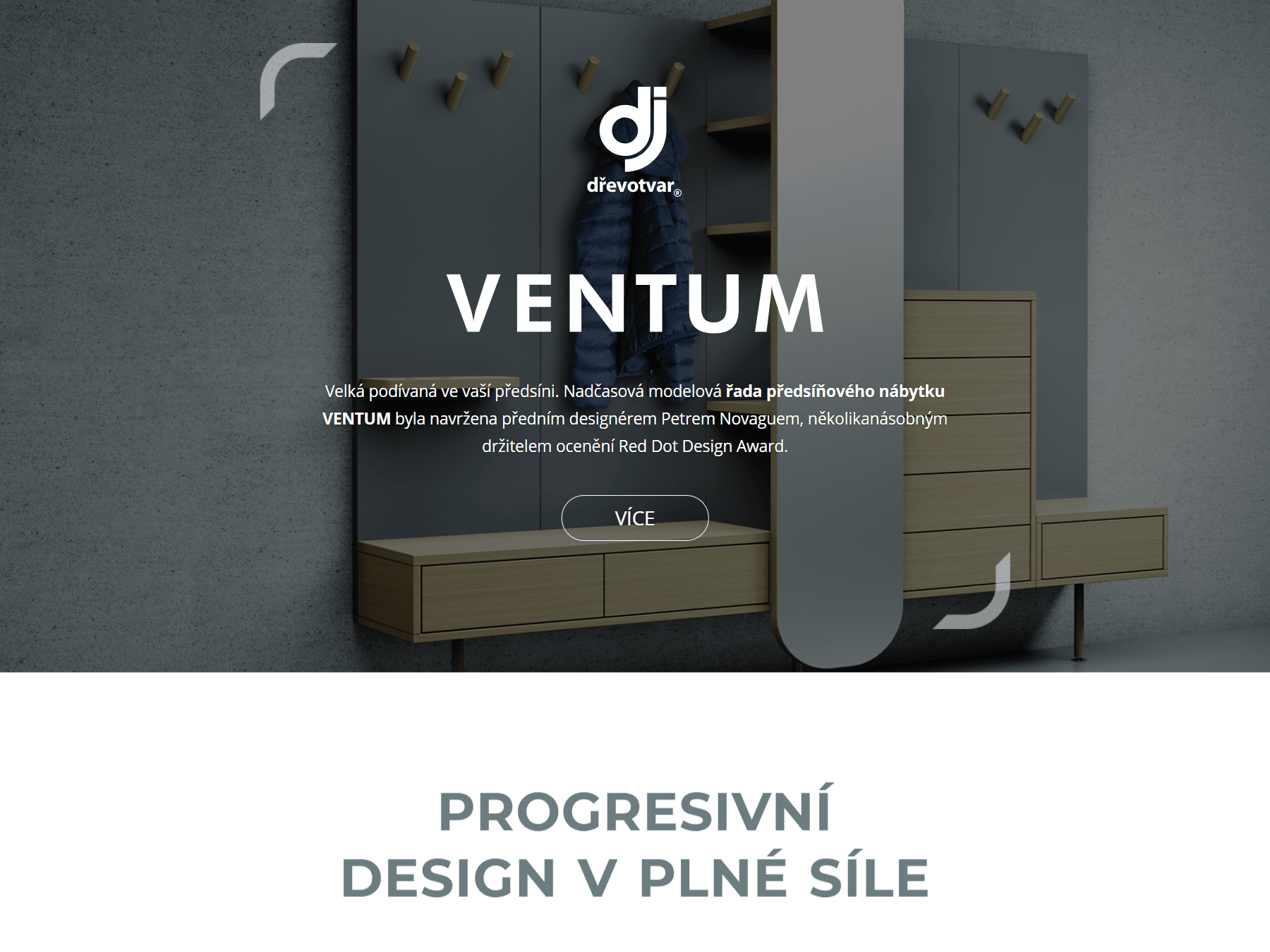 Dřevotvar - Jablonné nad Orlicí zařadilo mezi svůj sortiment novou předsíňovou modelovou stěnu VENTUM, kterou navrhlo designové studio Novague. Dostali jsme jasný úkol: "Navrhněte a nakódujte nejlepší možnou webovou stránku, ze které se zákazník dozví všechny potřebné informace o stěně".