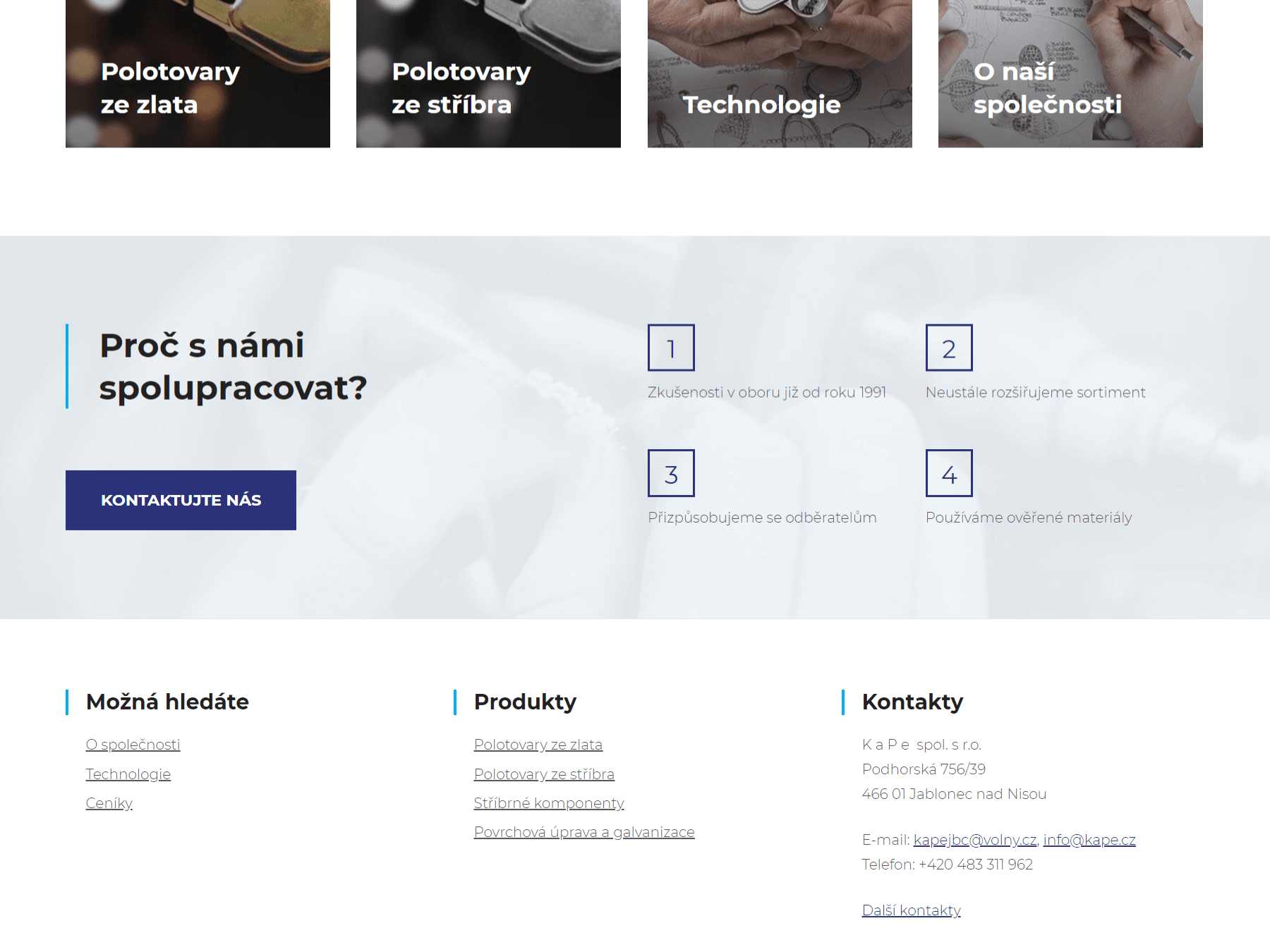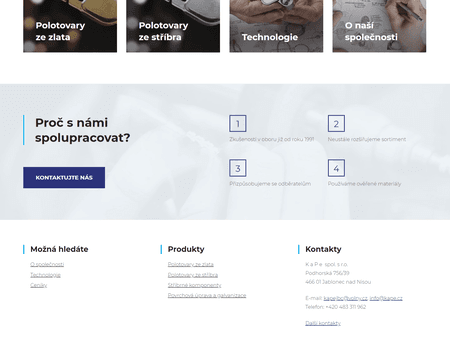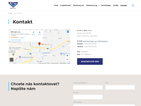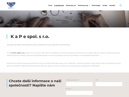 Společnost K a P e z Jablonce nad Nisou nám dala svou důvěru a tak jsme pro ni mohli vyrobit novou webovou prezentaci, která přehlednou formou představuje její služby a výrobní sortiment. Web naleznete na adrese www.kape.cz.